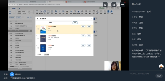 2月23日,由北京超星集团超星职业教育研究院高级讲师魏雅倩以《在线课程建设之资源应用》为题对全院教师进行了在线课程建设中资源建设和应用方法的培训。她从示范教学包使用、资源引用和自建资源三个方面介绍了基于超星泛雅平台的在线开放课程建设方法,结合实例演示了超星泛雅平台资源引用方法,为我院精品在线开放课程建设提供了指导性建议。