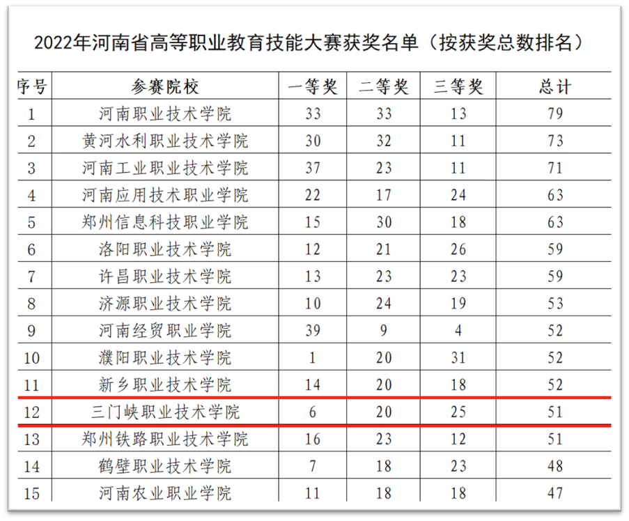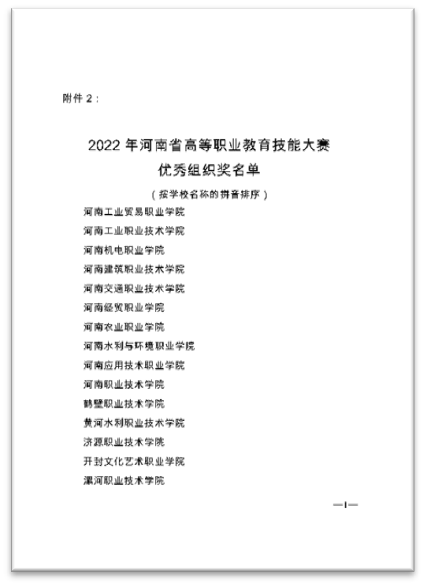 近日,河南省教育厅公布了《2022年河南省高等职业教育技能大赛拟获奖名单》,我院在学生组中共获得奖项51项,在教师组中共获得奖项1项,并荣获“优秀组织奖”。