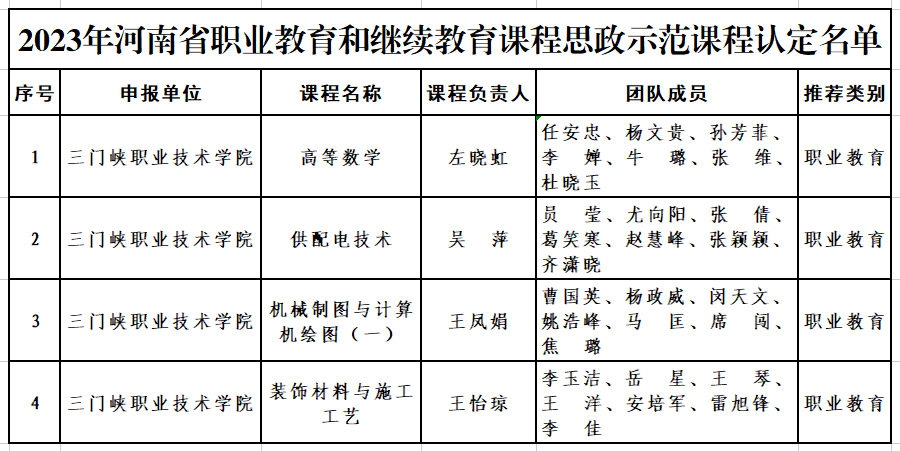 近日,河南省教育厅办公室印发了《关于公布2023年河南省职业教育和继续教育课程思政示范项目名单的通知》(教办职成〔2023〕197号),我院4门职业教育类课程全部获批立项。