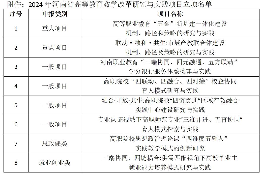 按照《河南省教育厅办公室关于开展2024年河南省高等教育教学改革研究与实践项目立项工作的通知》(教高〔2024〕24号)要求,经个人申报,院部审核推荐,校外专家多次评审,现将推荐名单予以公示(见附件)。