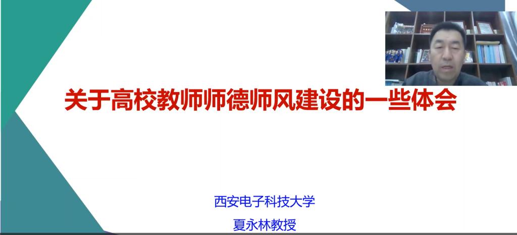 本期“周三大讲堂”特邀陕西省教学名师、陕西省优秀思政课教师,西安电子科技大学马克思主义学院夏永林教授作题为《关于高校教师师德师风建设的一些体会》的专题培训。夏永林教授重点从“习近平总书记关于师德师风重要论述”和“教育部关于师德师风建设要求”的两个方面进行交流。首先,通过引入习近平总书记在北京师范大学与师生座谈会上的要求,强调青年教师要不忘初心,铸就师魂,争做“四有”好老师;并传达了习近平总书记2016年在“八一学校”的讲话精神,鼓励广大教师要做学生的“四个引路人”。随后夏教授以《教育部关于建立健全高校师德建设长效机制的意见》等七个文件为依托,强调师德师风建设的重要性,激励教师要把教书育人和自我修养结合起来,做到以德立身、以德立学、以德施教。最后,夏教授就如何在教育教学中践行师德师风要求提出三点建议:一是深化学习之基,强化师德师风意识,铸就师魂璀璨;二是追随楷模之光,勇攀师德师风高峰,争做时代先锋;三是根植立德树人之心,紧扣教书育人之核,融合知识传授、能力培养与价值引领之翼。