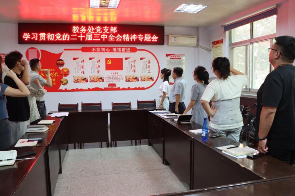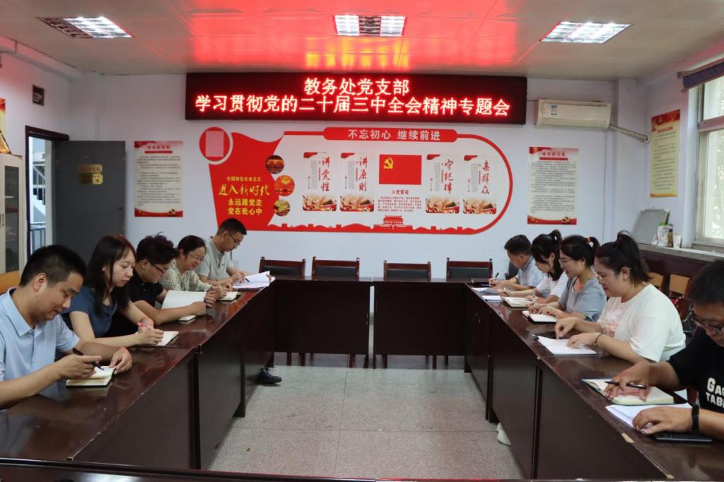 为深入学习贯彻党的二十届三中全会精神,9月18日下午,教务处党支部在天鹅湖校区2号教学楼2202室召开了以“深学全会精神 凝聚奋进力量”为主题的党日活动。教务处全体党员参加了会议。