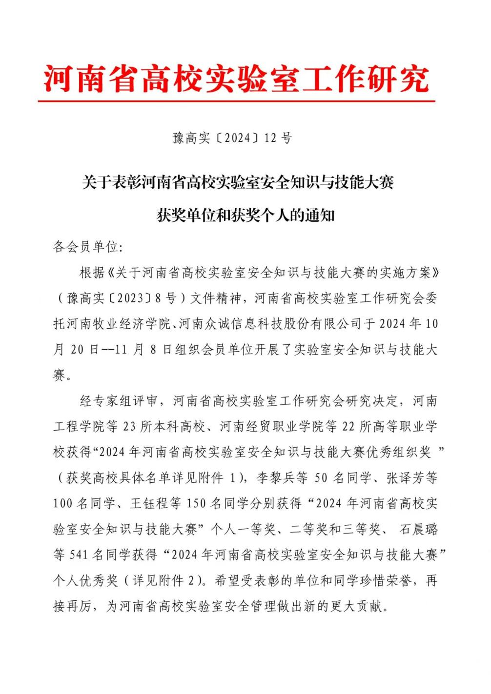12月13日,河南省高校实验室工作研究会印发《关于表彰高校实验室安全知识与技能大赛获奖单位和获奖个人的通知》(豫高实〔2024〕12号),我院凭借出色的组织工作和积极参与,荣获优秀组织奖,智能制造学院尧红康、汽车学院朱硕豪、师范学院杜清云等9名同学分别获得个人三等奖和优秀奖。