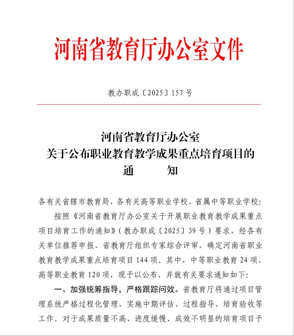 近日,河南省教育厅印发《关于公布职业教育教学成果重点培育项目的通知》(教办职成〔2025〕157号),我院申报的3个项目全部入选河南省职业教育教学成果重点培育项目一等奖名单。